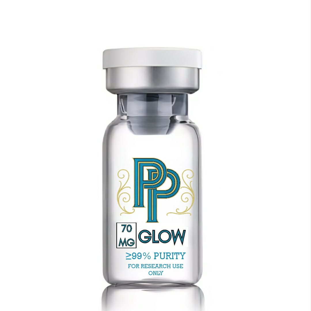 GLOW is a lyophilized peptide blend supplied in a 70mg vial. It is provided exclusively for laboratory-based, in vitro research applications. GLOW has been studied in experimental models for its potential role in regenerative, anti-inflammatory, and dermal repair pathways under controlled research conditions.
